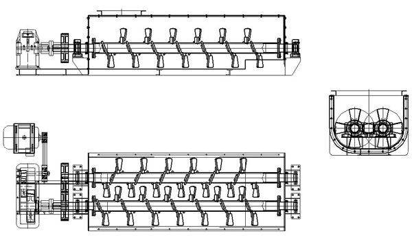 臥式雙軸攪拌機主要由機殼、螺旋軸總成、驅(qū)動裝置、配管、蓋板、鏈罩等部件組成,具體結(jié)構(gòu)性能特點如下: